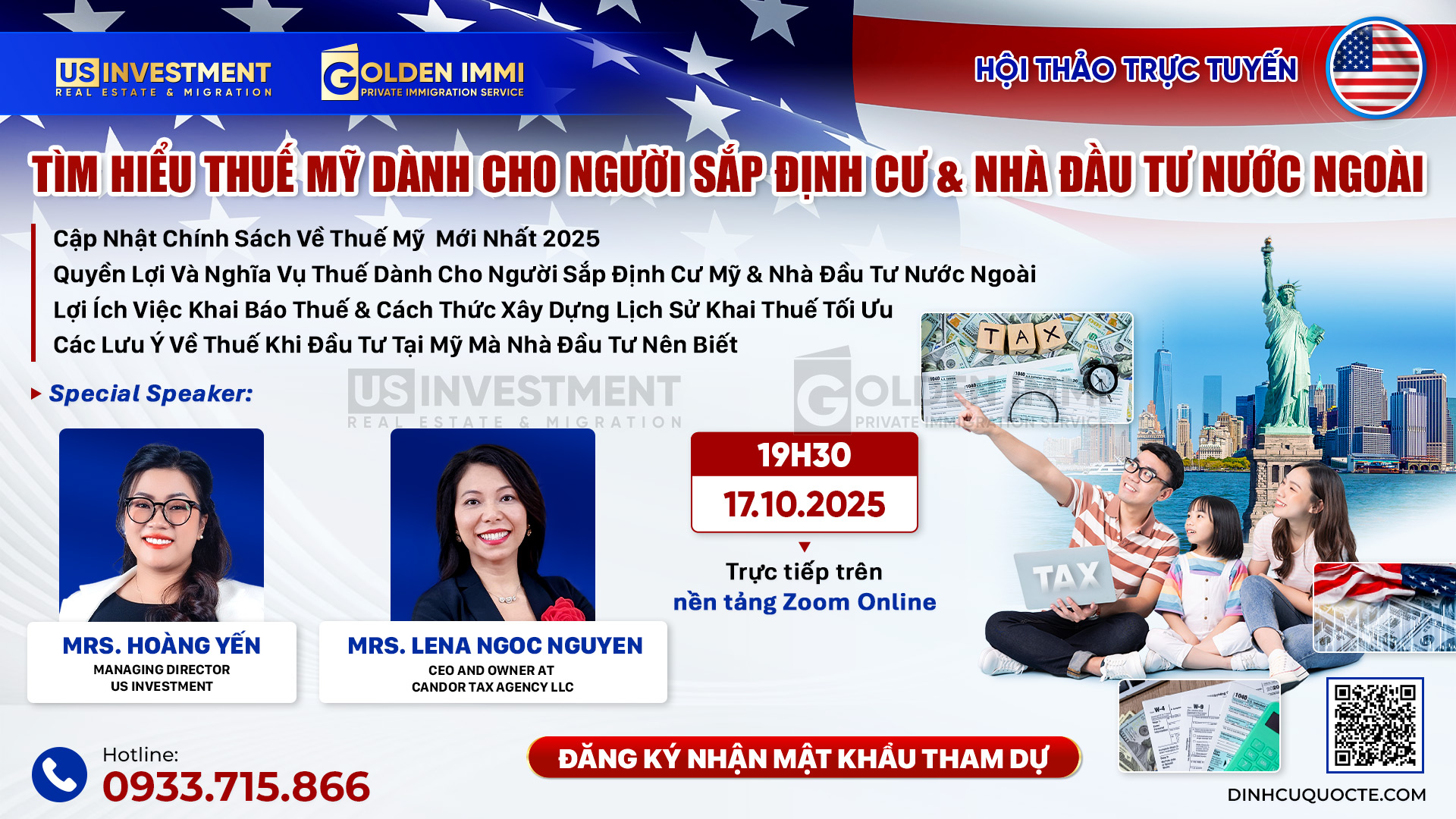 Vào lúc 19h30 tối thứ 6 ngày 17/10/2025 tới đây Us Investment & Golden Immi tổ chức hội thảo trực tuyến với chủ đề: “CÙNG CHUYÊN GIA TÌM HIỂU THUẾ MỸ DÀNH CHO NGƯỜI SẮP ĐỊNH CƯ & NHÀ ĐẦU TƯ NƯỚC NGOÀI” nhằm mang lại quý Anh Chị những thông tin giá trị về thuế được chia sẻ bởi chuyên gia thuế Mỹ giàu kinh nghiệm (Certified Public Accountant - CPA).