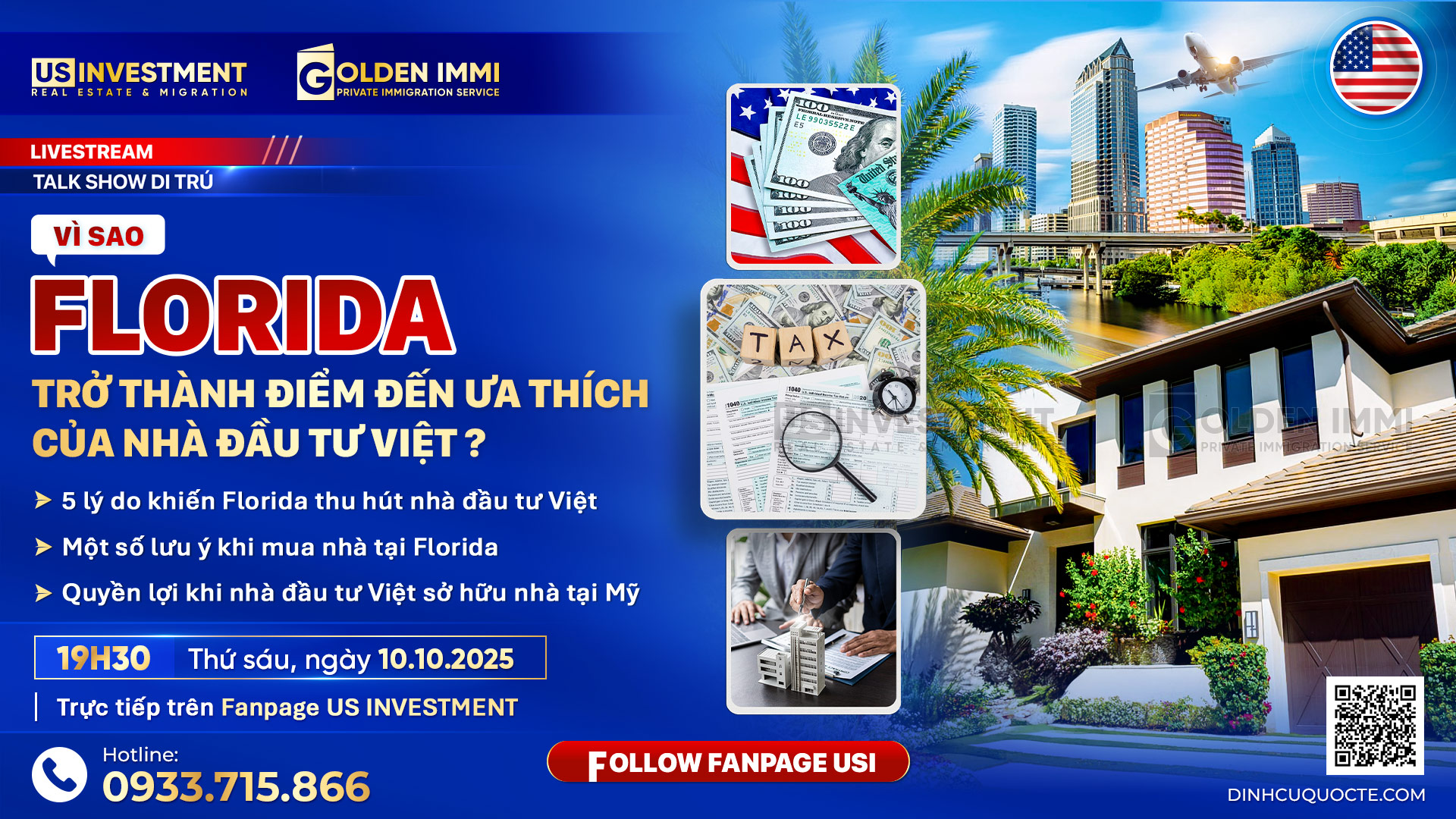 Quý Anh Chị quan tâm có thể bấm Follow Fanpage Us Investment - Đầu Tư Định Cư Quốc Tế để nhận thông tin khi buổi Livestream Talkshow Di trú với chủ đề: “VÌ SAO FLORIDA TRỞ THÀNH ĐIỂM ĐẾN ƯA THÍCH CỦA NHÀ ĐẦU TƯ VIỆT” được bắt đầu.