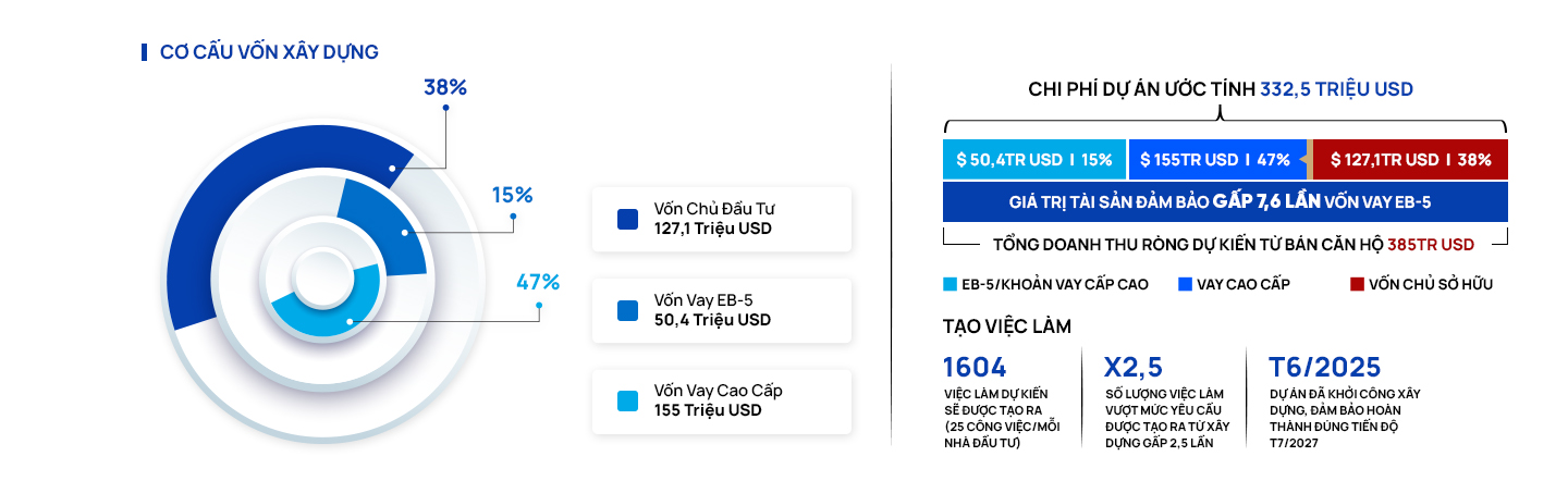 - Cơ cấu vốn an toàn: Vốn chủ sở hữu 38% ($127.1 triệu), vốn vay ngân hàng 47% ($155 triệu), vốn EB-5 15% ($50.4 triệu); LTV chỉ 36%.