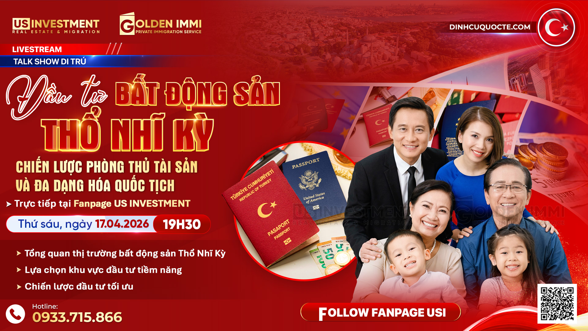 Quý Anh Chị quan tâm có thể bấm Follow Fanpage Us Investment - Đầu Tư Định Cư Quốc Tế để nhận thông tin khi buổi Livestream Talkshow Di trú với chủ đề: “ĐẦU TƯ BẤT ĐỘNG SẢN THỔ NHĨ KỲ - CHIẾN LƯỢC PHÒNG THỦ TÀI SẢN VÀ ĐA DẠNG HÓA QUỐC TỊCH” được bắt đầu.