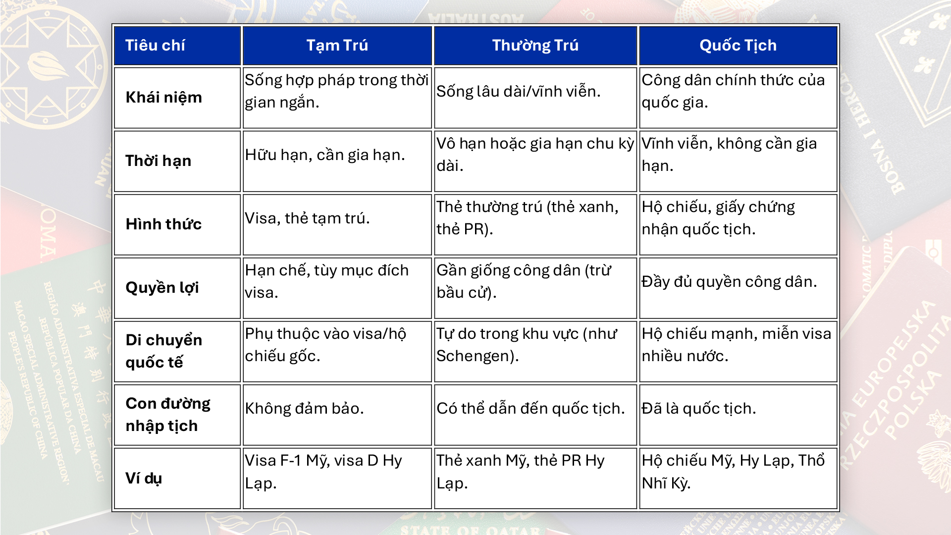 - Tùy quốc gia: Quyền lợi và yêu cầu của tạm trú, thường trú, quốc tịch khác nhau tùy theo luật nhập cư từng nước. Ví dụ, Hy Lạp không yêu cầu lưu trú tối thiểu cho Golden Visa, nhưng Mỹ yêu cầu cư trú liên tục để giữ thẻ xanh.