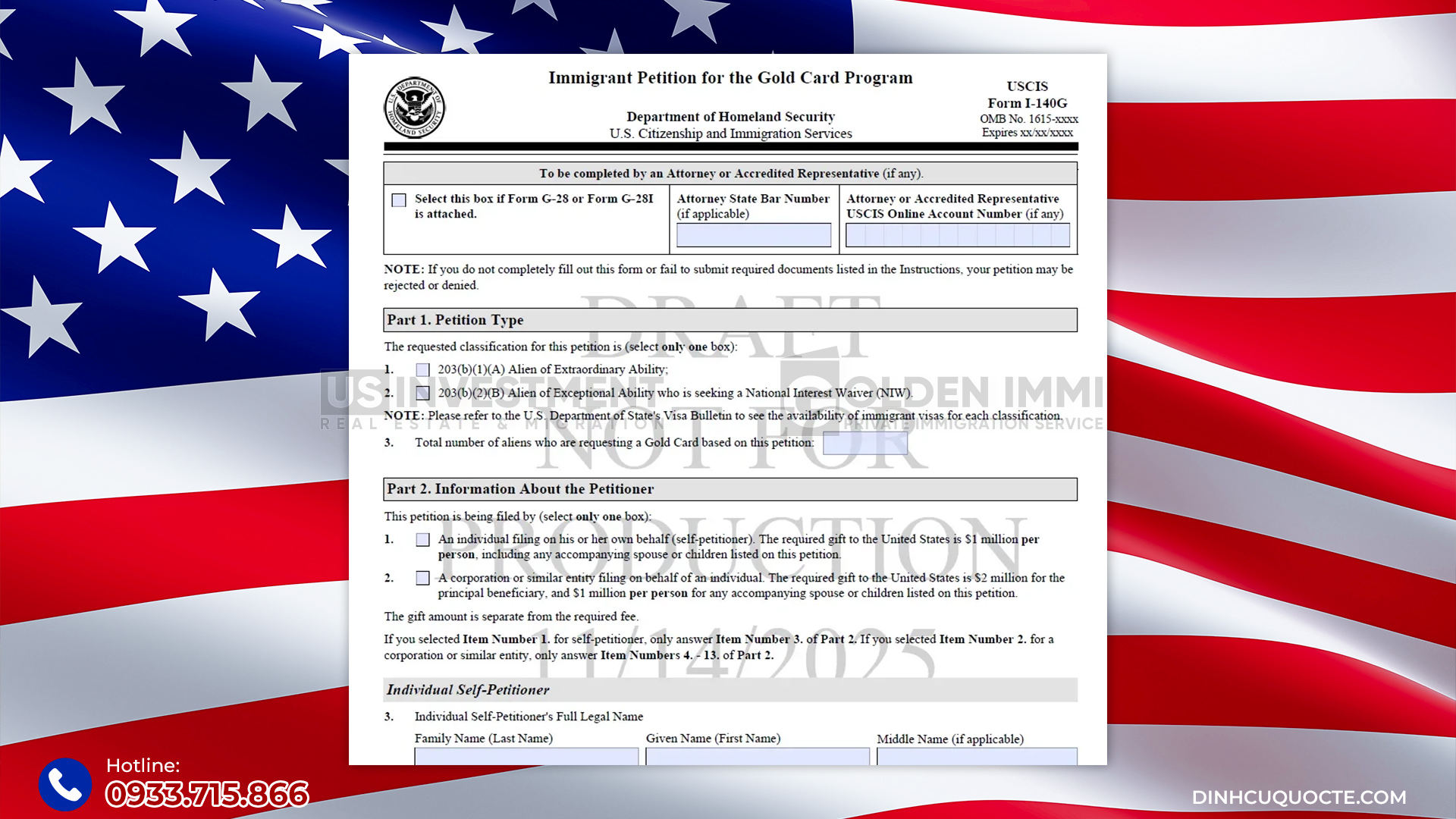 Sở Di trú và Nhập tịch Hoa Kỳ (USCIS) vừa nộp Mẫu đơn I-140G lên Văn phòng Quản lý và Ngân sách (OMB). Đây là bước cuối cùng để chính thức triển khai chương trình Thẻ Vàng Trump theo Sắc lệnh Hành pháp 14351, dự kiến ra mắt đúng ngày 18/12/2025.